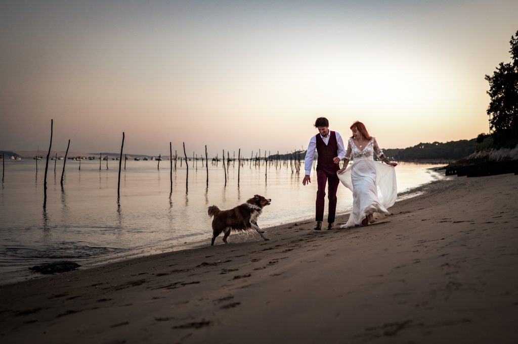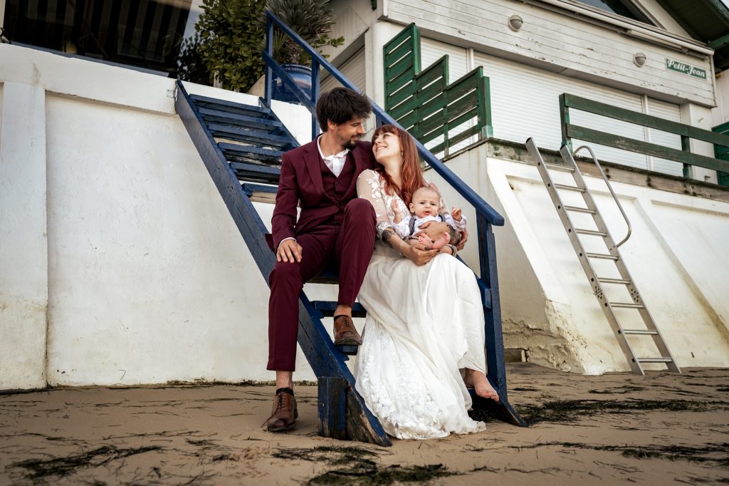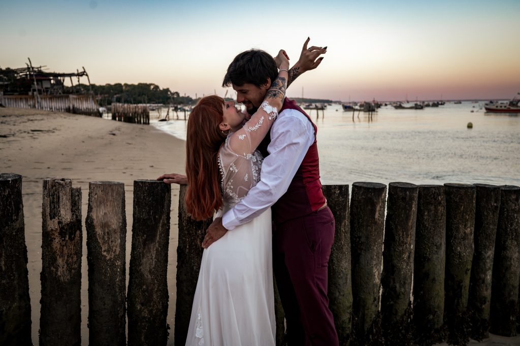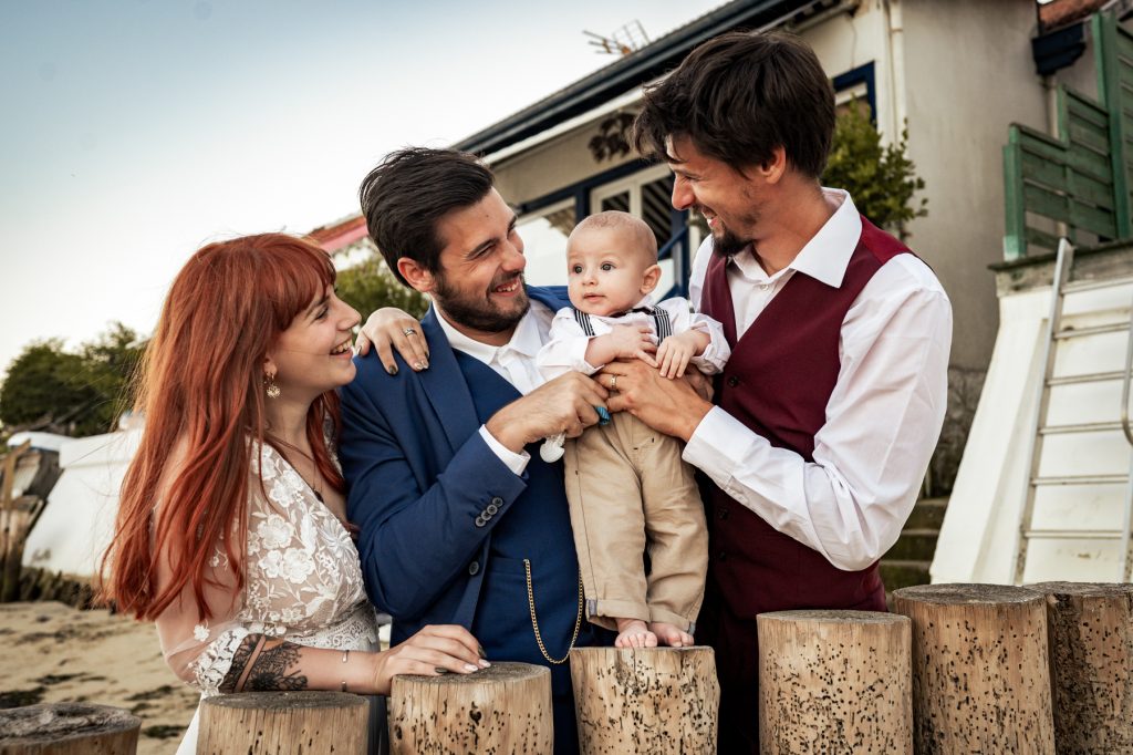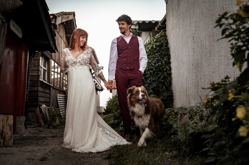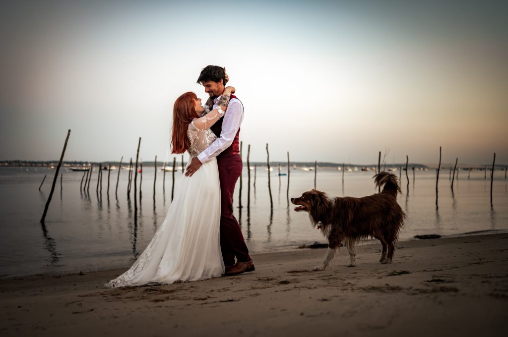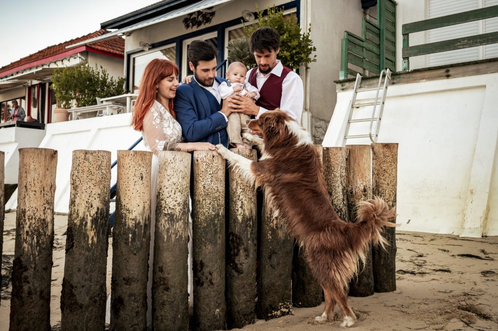 Aujourd’hui je vous embarque pour une séance vraiment pas comme les autres : les noces de coton de Jade et Benjamin ! Ces deux-là s’étaient dit oui en mode Peaky Blinders l’an dernier, ambiance années 20 et automne rock’n’roll. Et un an plus tard, me voilà à les retrouver au Cap Ferret, dans le mythique village de l’Herbe, avec un petit plus qui change tout : leur fils et leur chien Happy.