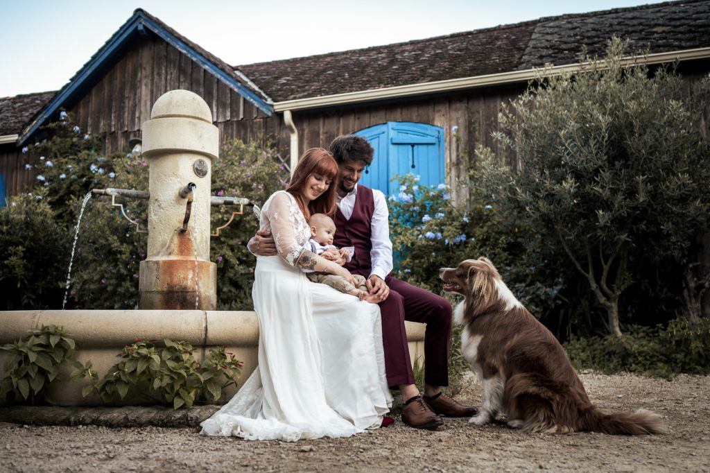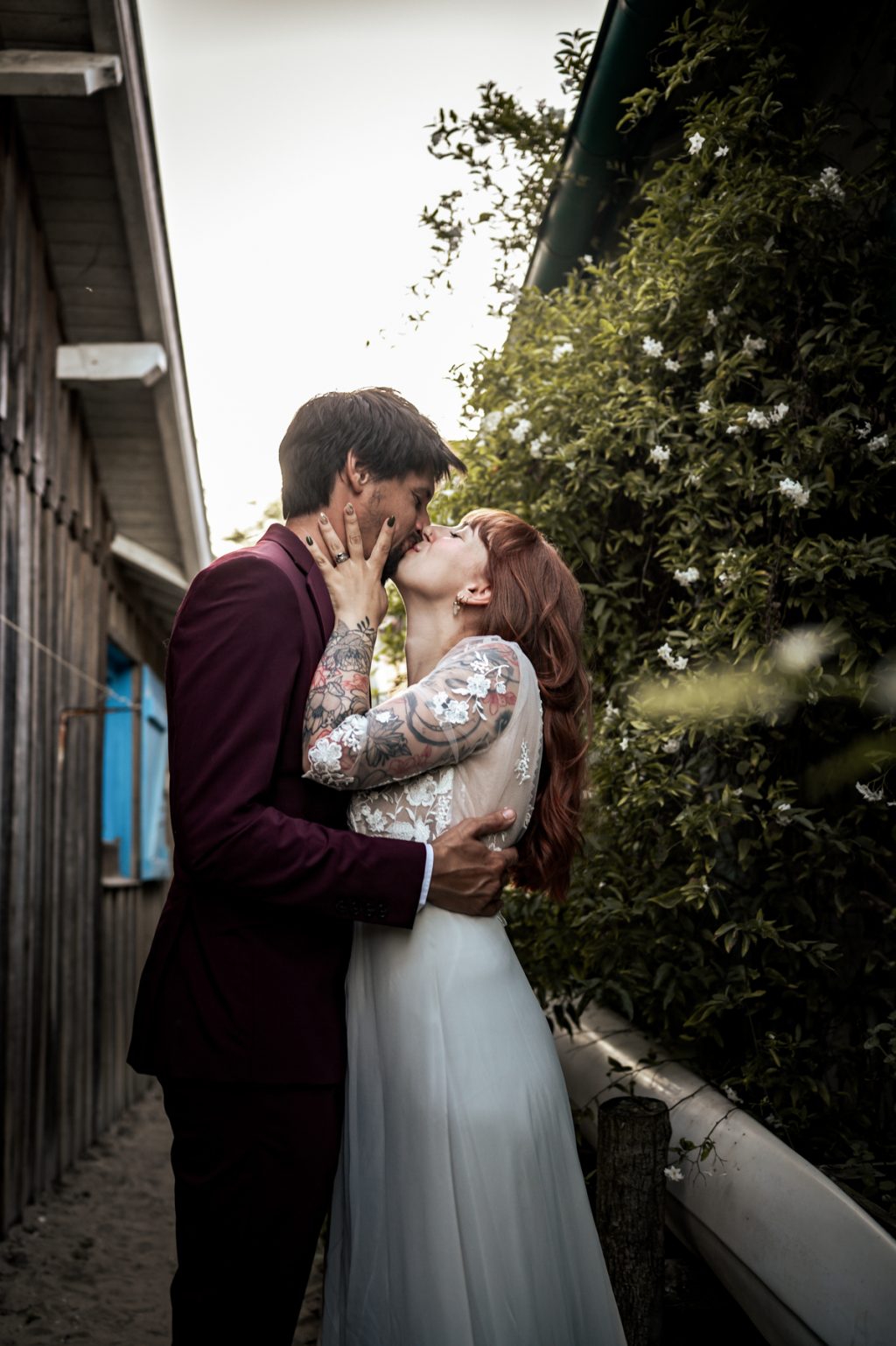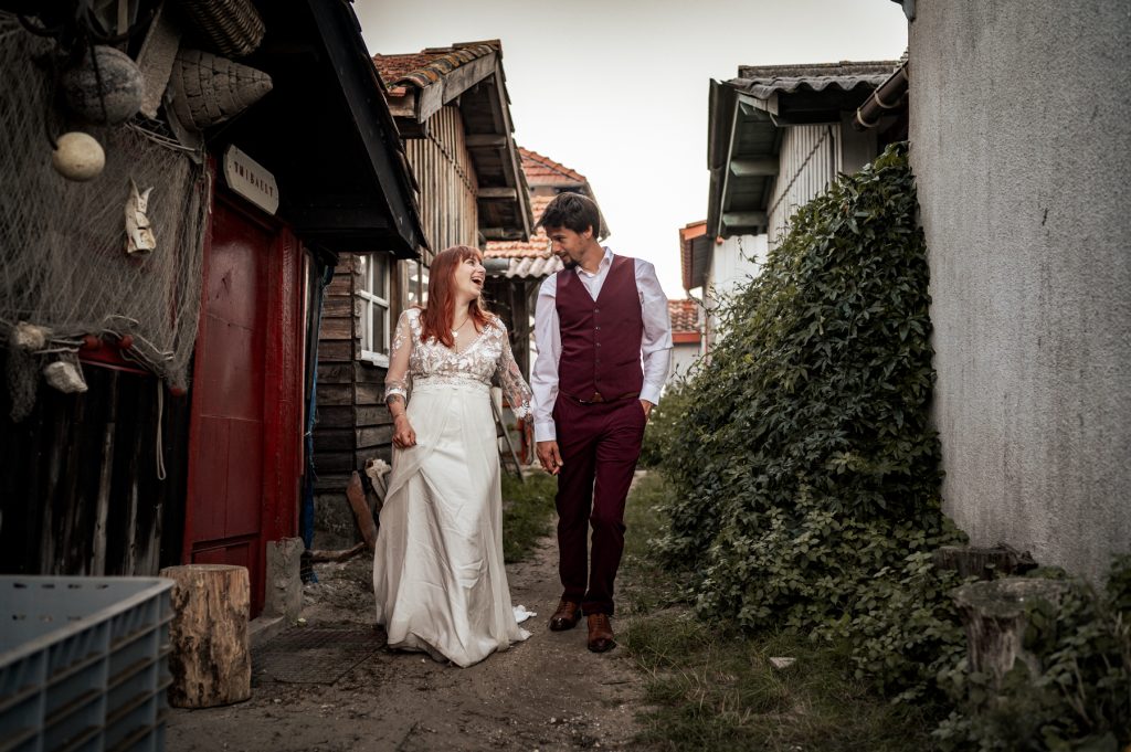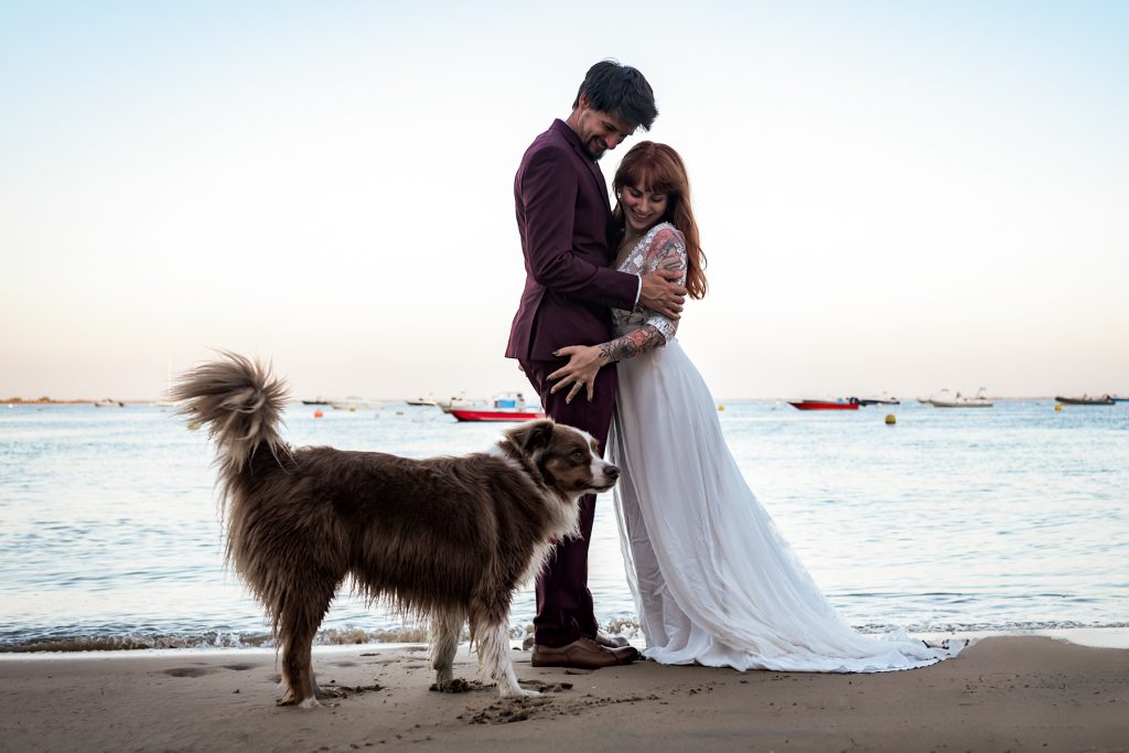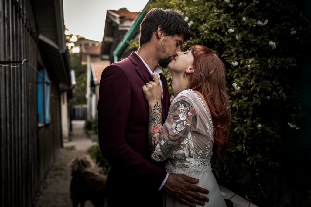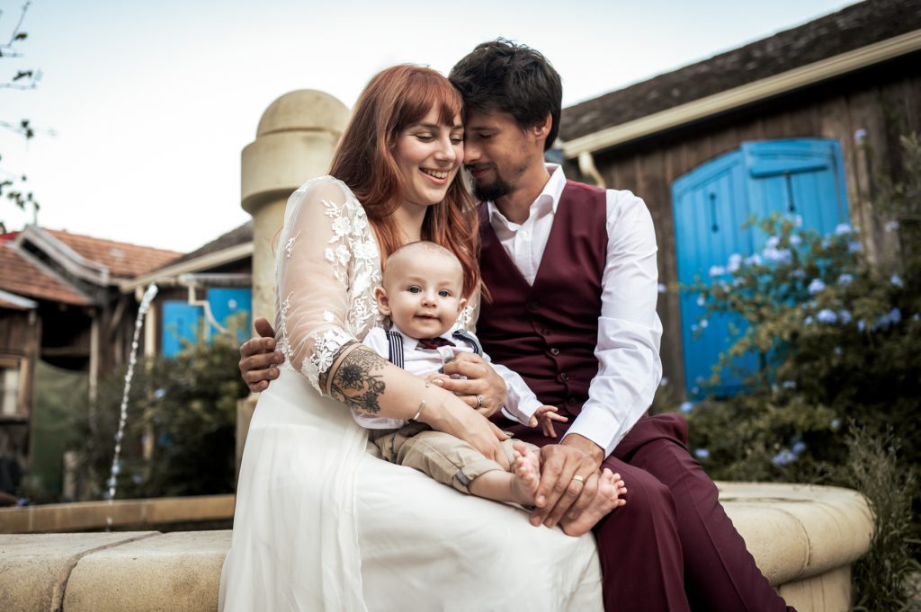 Aujourd’hui je vous embarque pour une séance vraiment pas comme les autres : les noces de coton de Jade et Benjamin ! Ces deux-là s’étaient dit oui en mode Peaky Blinders l’an dernier, ambiance années 20 et automne rock’n’roll. Et un an plus tard, me voilà à les retrouver au Cap Ferret, dans le mythique village de l’Herbe, avec un petit plus qui change tout : leur fils et leur chien Happy.