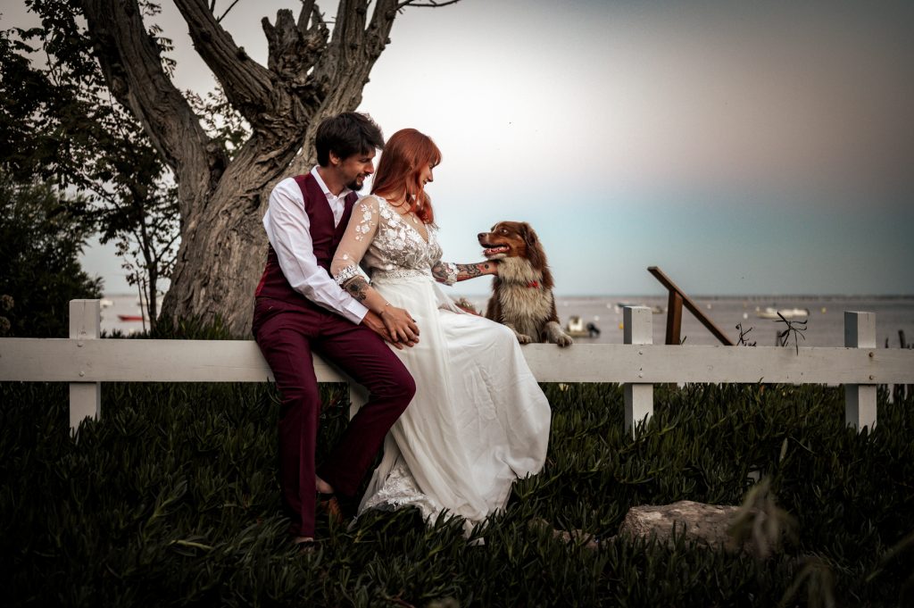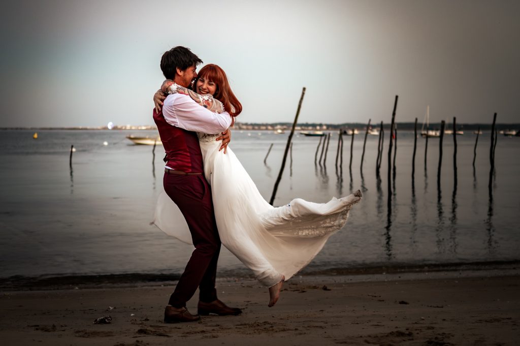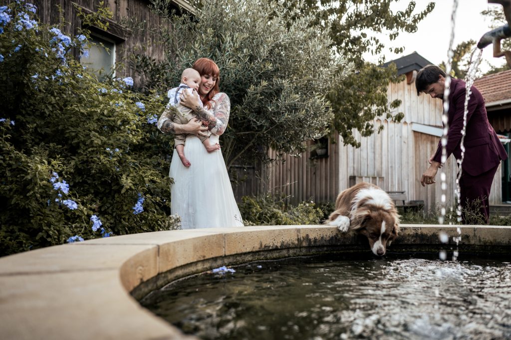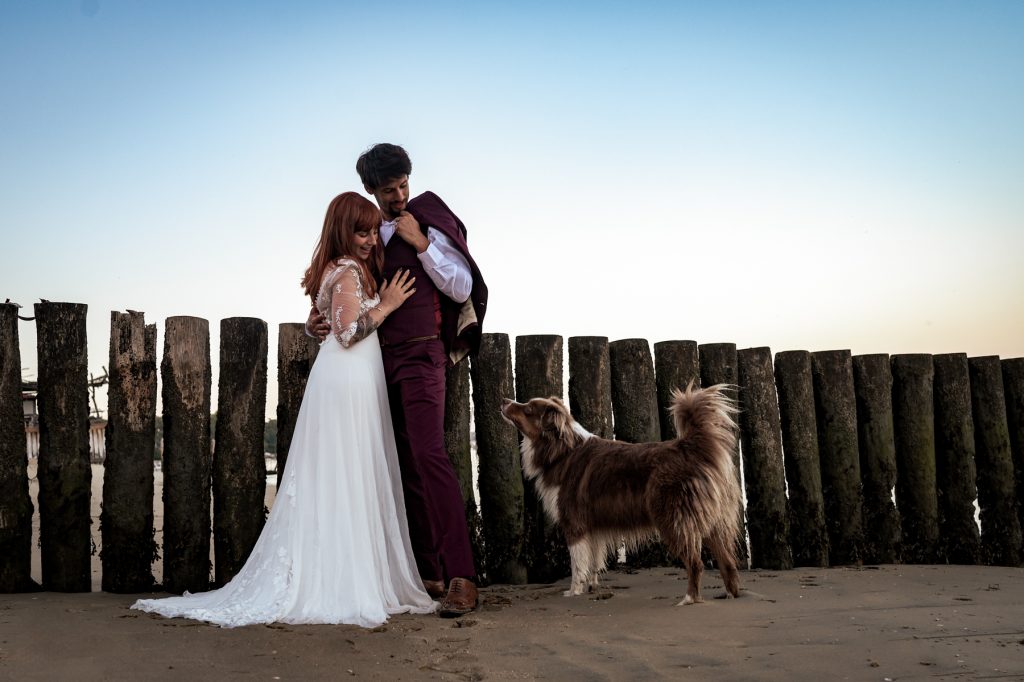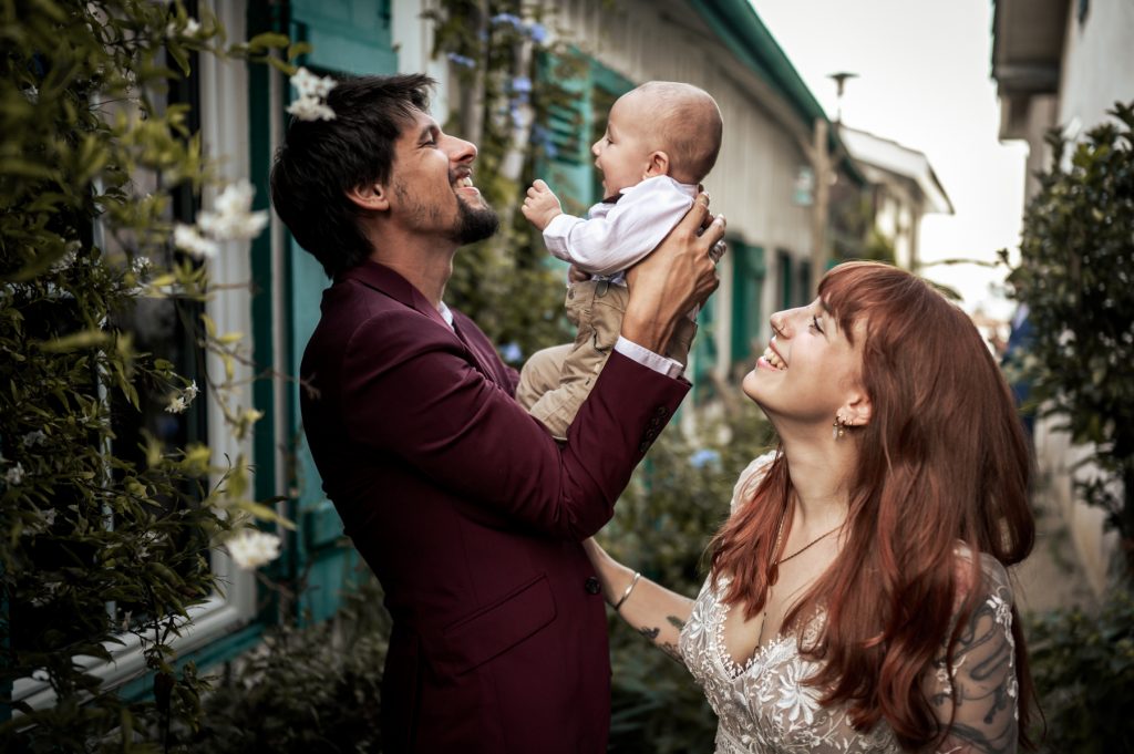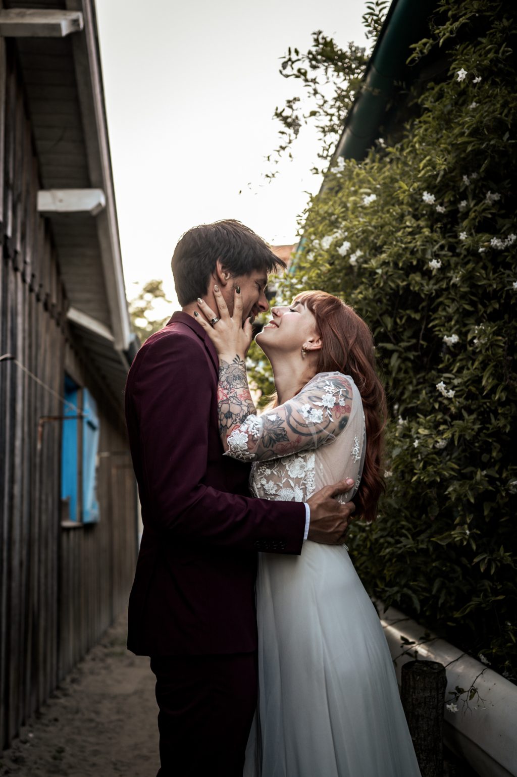 Aujourd’hui je vous embarque pour une séance vraiment pas comme les autres : les noces de coton de Jade et Benjamin ! Ces deux-là s’étaient dit oui en mode Peaky Blinders l’an dernier, ambiance années 20 et automne rock’n’roll. Et un an plus tard, me voilà à les retrouver au Cap Ferret, dans le mythique village de l’Herbe, avec un petit plus qui change tout : leur fils et leur chien Happy.