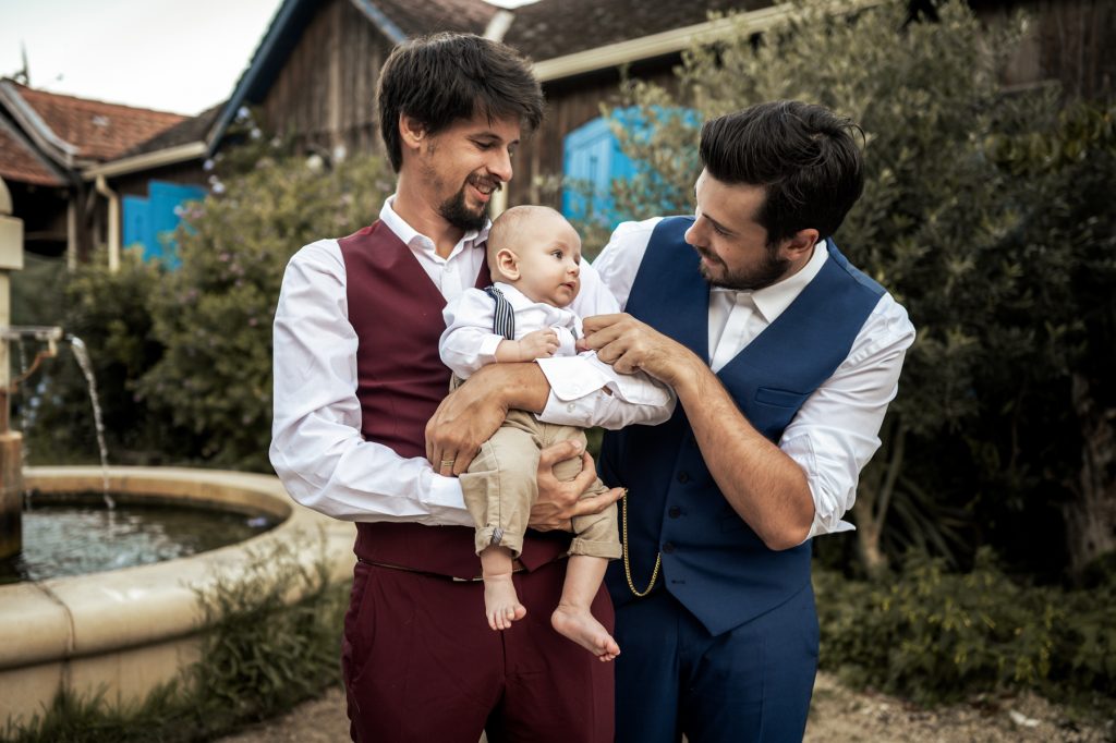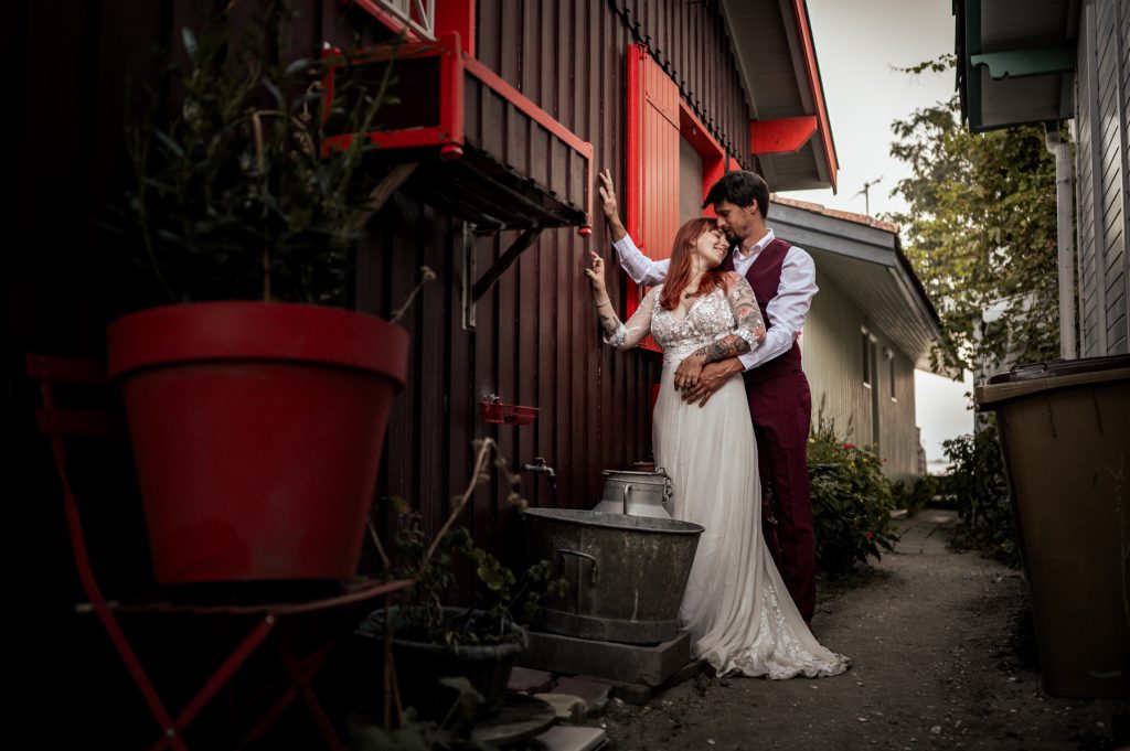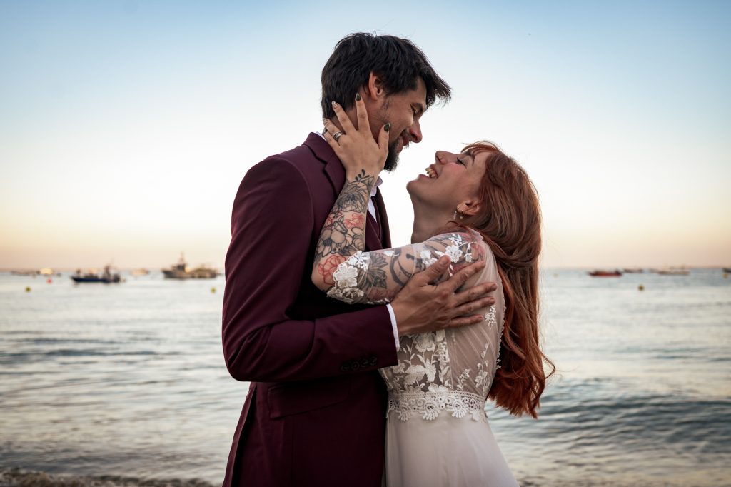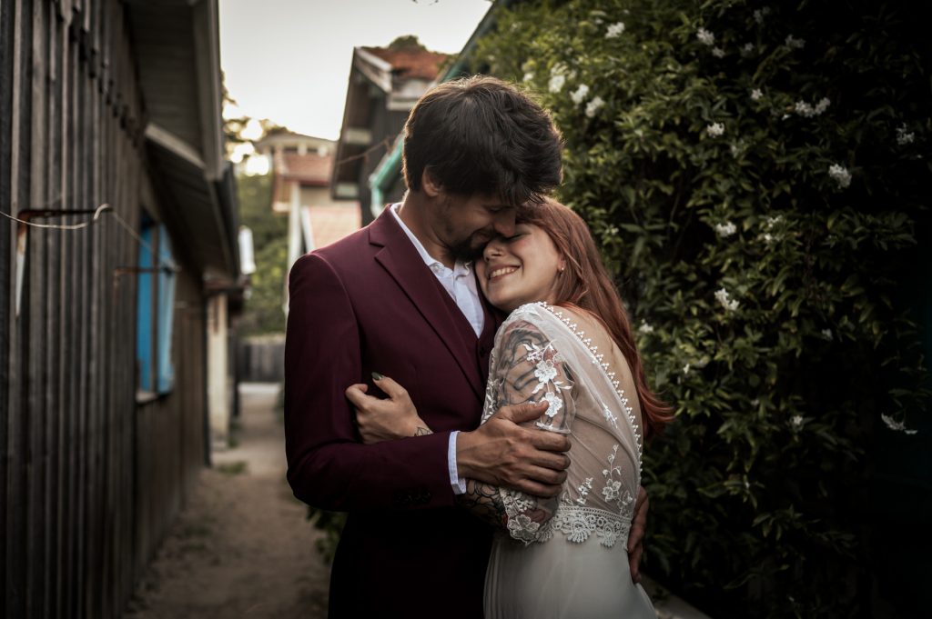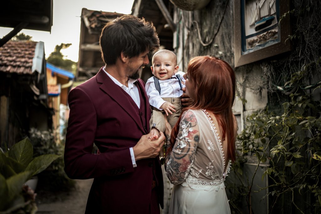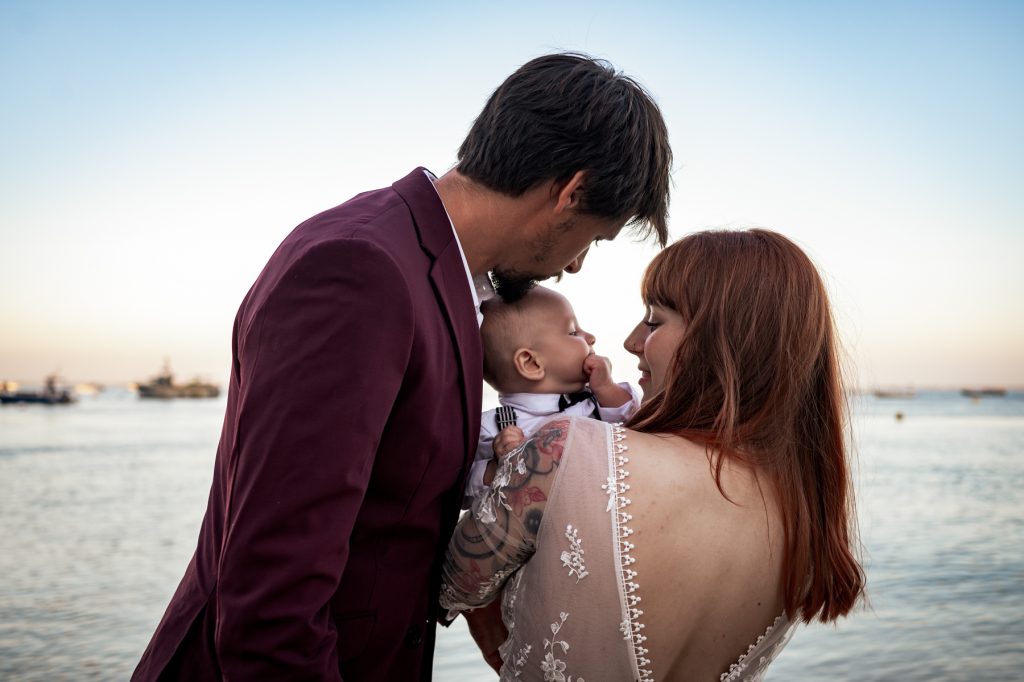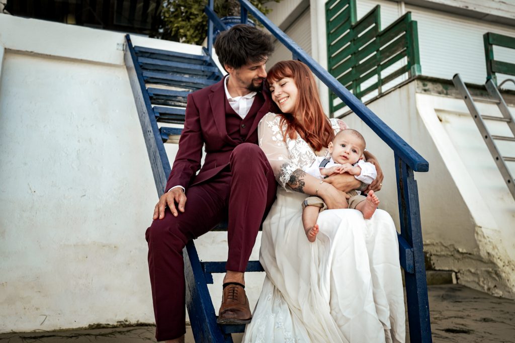 Aujourd’hui je vous embarque pour une séance vraiment pas comme les autres : les noces de coton de Jade et Benjamin ! Ces deux-là s’étaient dit oui en mode Peaky Blinders l’an dernier, ambiance années 20 et automne rock’n’roll. Et un an plus tard, me voilà à les retrouver au Cap Ferret, dans le mythique village de l’Herbe, avec un petit plus qui change tout : leur fils et leur chien Happy.